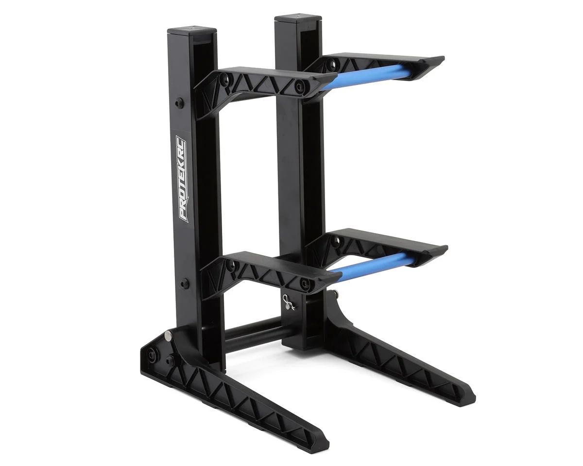 The ProTek RC Two-Layer Car Stand offers a sleek, space-saving way to organize and display up to two RC vehicles, designed primarily for 1/10 scale cars while also accommodating 1/8 scale models with a snug fit. Featuring a solid yet lightweight structure with durable aluminum legs and strong nylon arms, it includes anti-slip pads to keep vehicles secure. Its foldable design and included carrying bag make it ideal for easy storage, travel, and race-day use, all while freeing up valuable workspace.