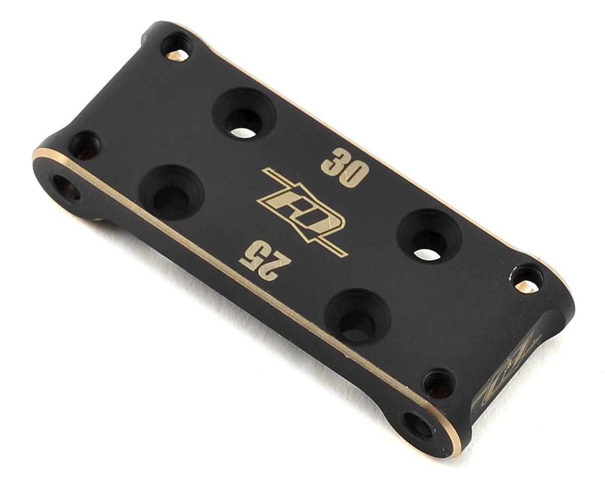 The RDRP B6 Brass Front Bulkhead replaces the stock plastic bulkhead, adding strength and weight. Machined from black coated brass and weighing in at 33g, this piece adds more weight to the front of the vehicle resulting in a more planted front end. The gold color chamfered edges give an aesthetic appeal. Designed for use with the Team Associated RC10B6 & B6D.
